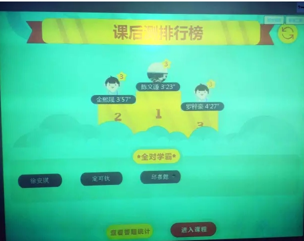 学生带着iPad来到教学点,老师一声令下,先来课前测,巩固上讲重要知识,点击提交答案,就能自动出分,黑板屏幕会显示测试成绩,大家排行榜上争高低!